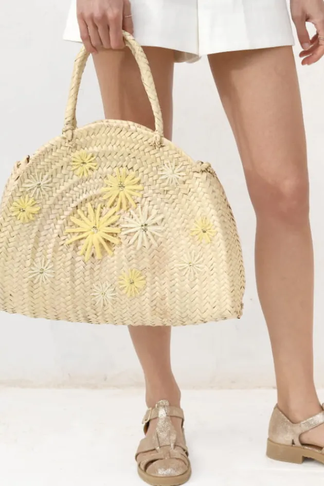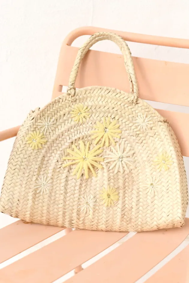 Panier Demi Cercle Brode De Motifs Marguerites Jaune PaleDimensions : 42 X 34 X 10 CmLanieres Courtes En RaphiaFabrique …