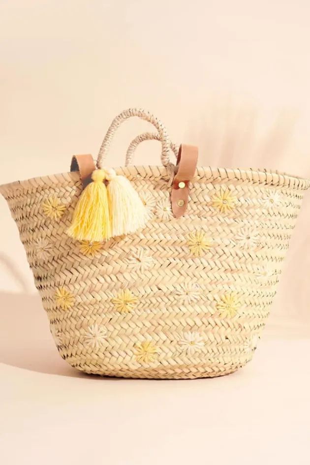 - Grand Panier Brode Marguerites Fil De Coton Ecru, Citron Et Sequins Dores Avec 2 Pompons, Laniere Cuir