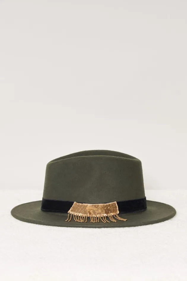 - Chapeau A Bords Courts En Feutre Kaki, Orne D’Un Galon Velours Frange Sequins.