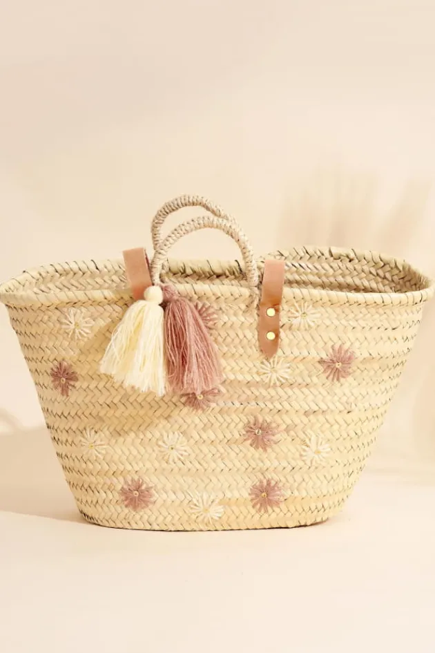 - Grand Panier Brode Marguerites Fil De Coton Ecru, Rose Et Sequins Dores Avec 2 Pompons, Laniere Cuir