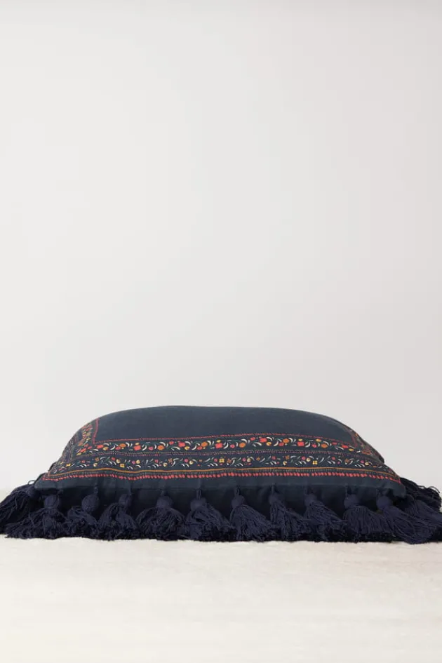 Coussin En Coton Imprime, Motif Frise Balkans Sur Fond Marine.Pompons En Coton Sur Les Cotes.Fermeture Zippee Au Dos.Dim…