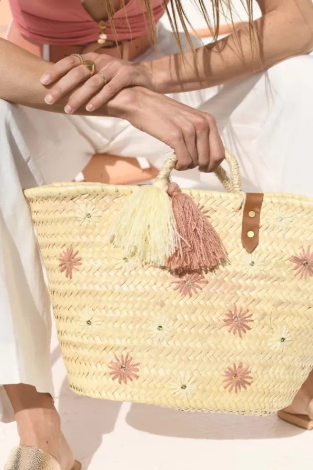 - Grand Panier Brode Marguerites Fil De Coton Ecru, Rose Et Sequins Dores Avec 2 Pompons, Laniere Cuir