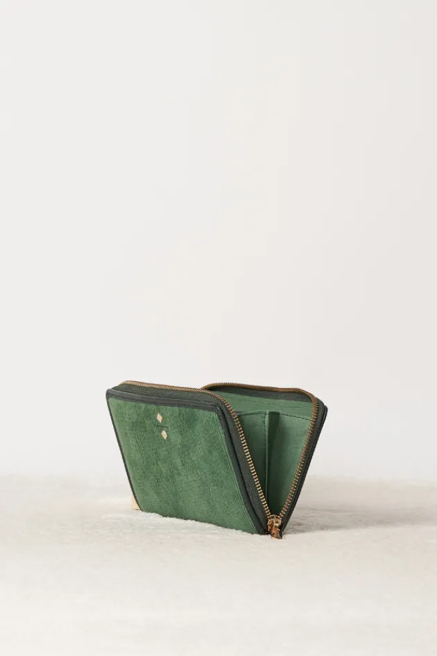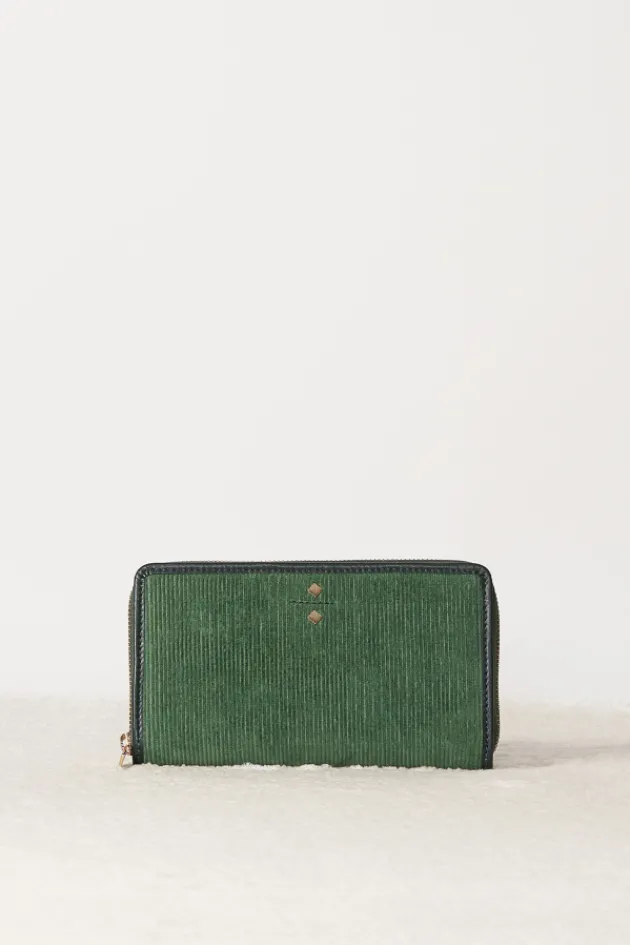 - Portefeuille Compagnon En Velours Cotele Et Piping En Cuir Lisse Vert.