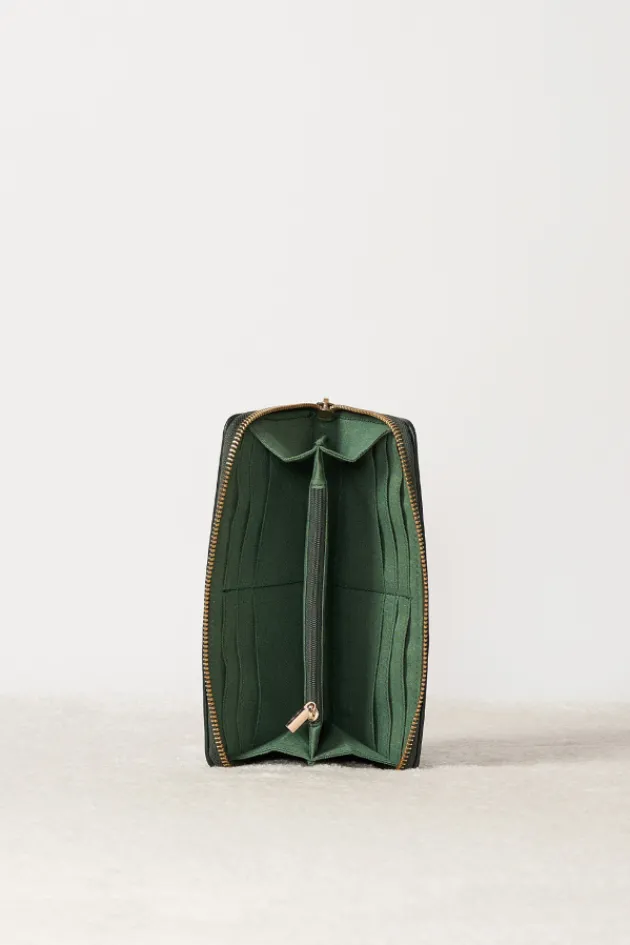 Portefeuille Compagnon En Velours Cotele Et Piping En Cuir Lisse Vert.2 Losanges Dores Et Fermeture Zippee.Interieur Ave…
