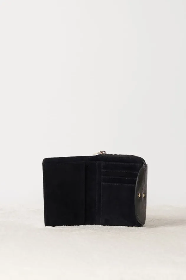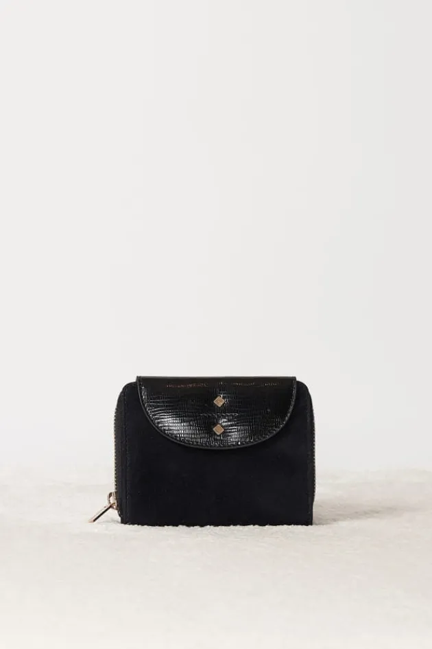- Portefeuille En Cuir Velours Noir Avec Rabat Aimente En Cuir Reptile Noir.