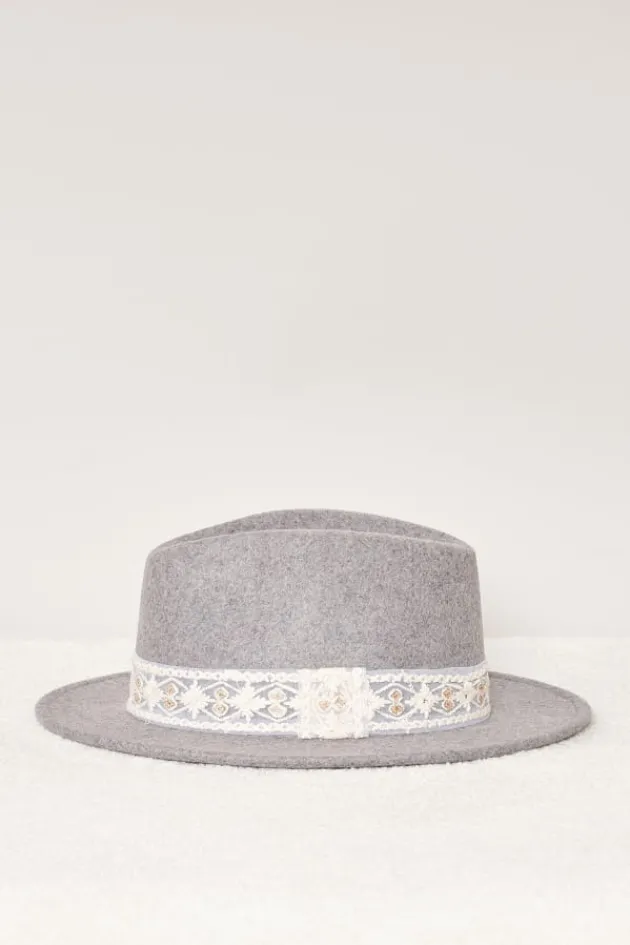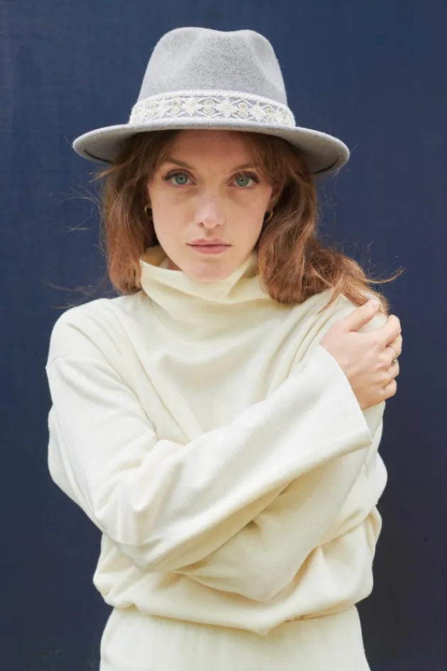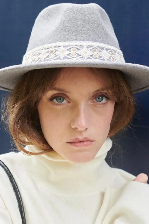 - Chapeau A Bords Court En Feutre Gris Chine, Orne D’Un Galon Brode A Motifs Geometriques.