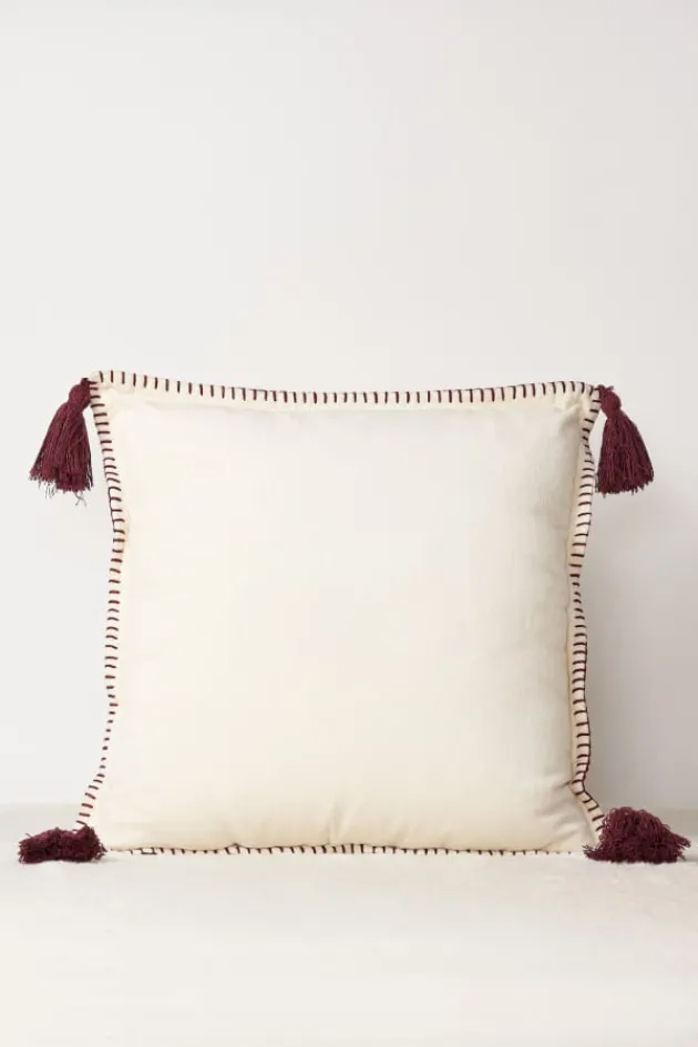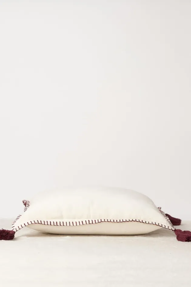 - Coussin En Velours Ecru Avec 4 Pompons Et Bordures Brodees En Coton Pourpre.