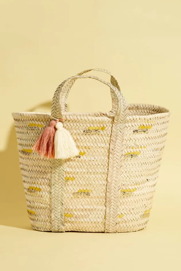 - Panier A Motifs En Paille Coloree Jaune Et Sequins Dores, Orne De Deux Pompons