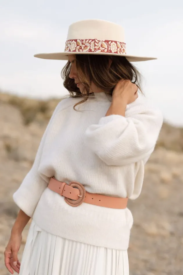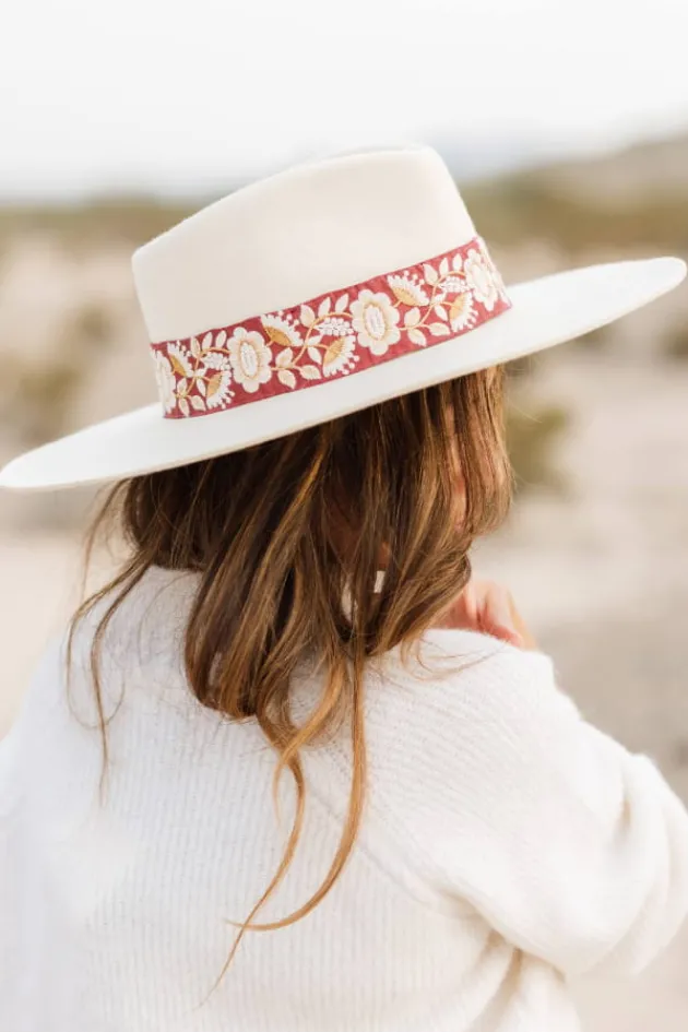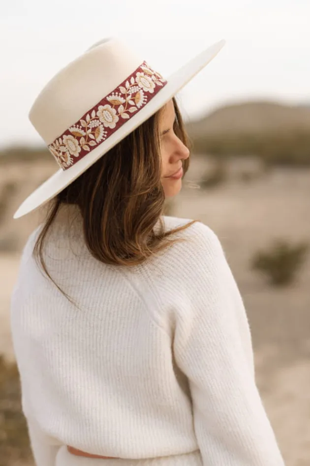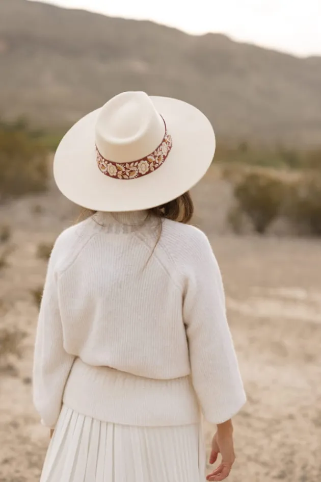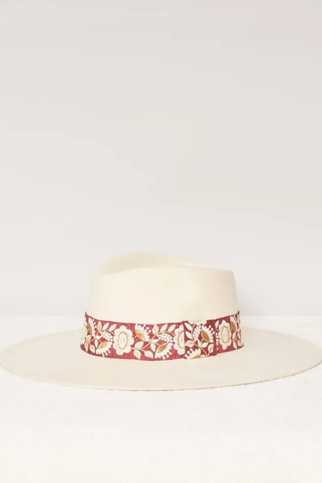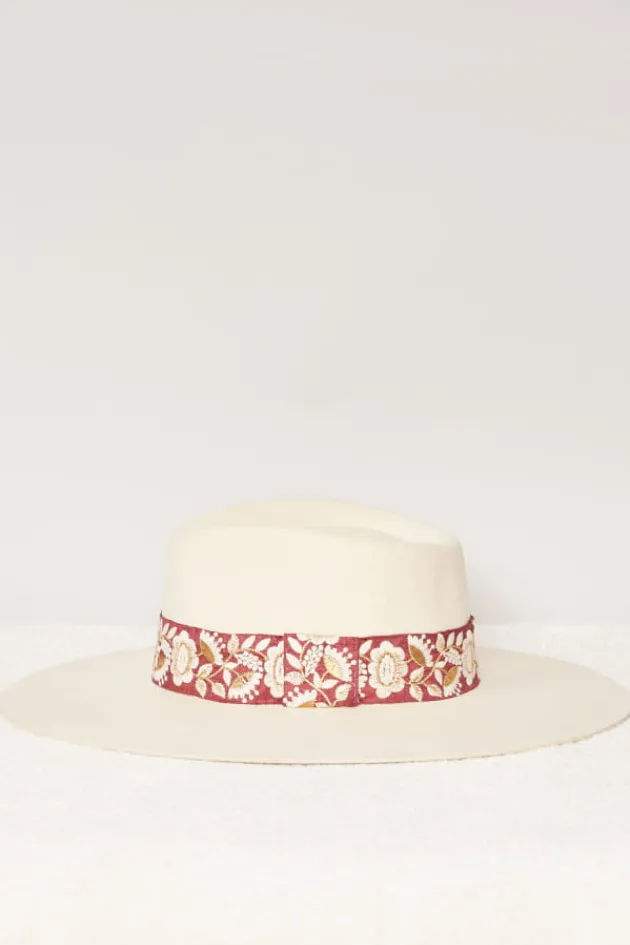 - Chapeau A Bords Extra Larges En Feutre Ecru 100% Laine, Orne D’Un Galon Fleurs Brodees.