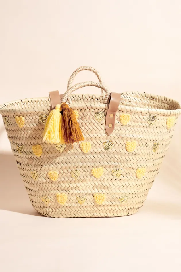 Grand Panier En OsierMotifs Coeurs Brodes En Fil De Laine Blanc Et Sequins Dores Sur Un Cote Du PanierAnses Courtes Et A…