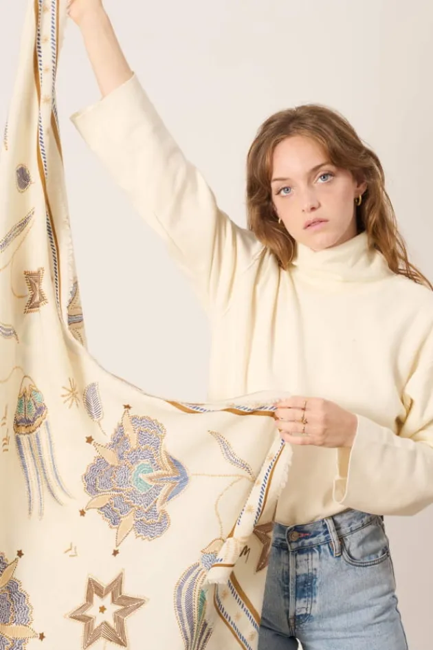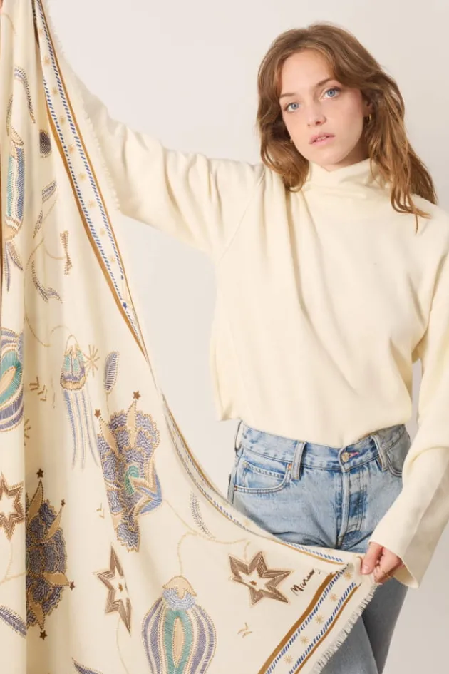 Carre De Laine Et Soie Imprime.Motif Istanbul Sur Fond Ecru.Finition Bords Franges.Dimensions : 130 X 130 Cm.Fabrique En…
