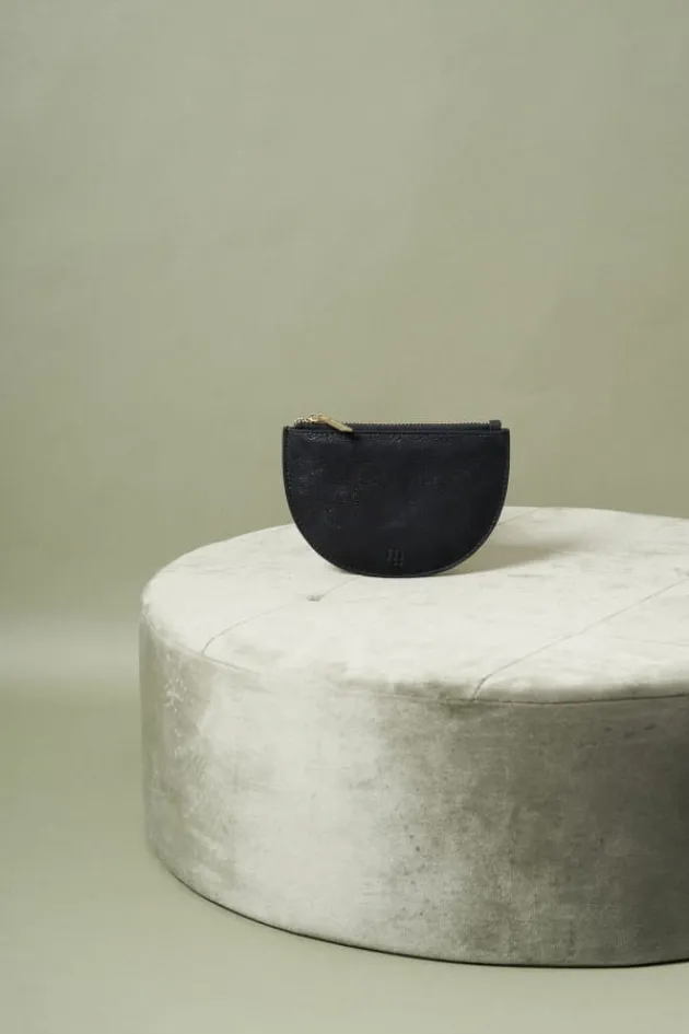 - Porte-Monnaie Forme Demi-Lune En Cuir D’Agneau Noir Metallise