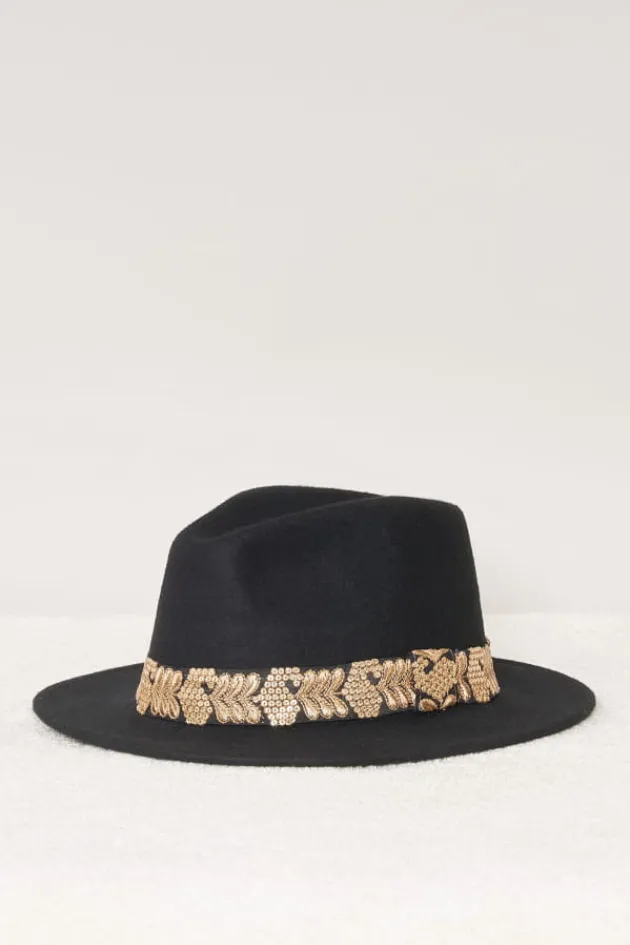 - Chapeau A Bords Court En Feutre Noir, Orne D’Un Galon Brode A Sequins Dores.